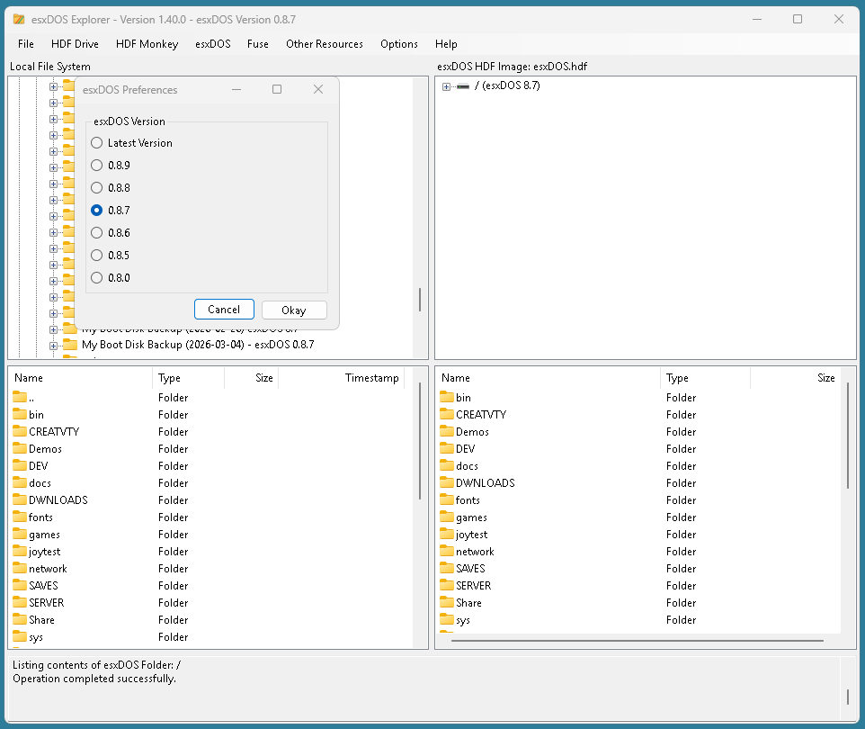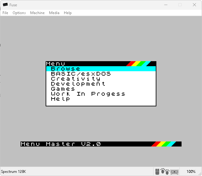 The final result is so much more, with HDFMonkey automations, multiple file and folder drag and drop both ways, formatting HDF files, renaming files and folders locally and with the HDF, and automated download and installation of esxDOS, with checks for the latest version, divMMC ROM flashing wizards for Fuse, and optional automatic installation of a commonly used third party tools and extensions, including a customizable boot menu that has the feel of the Spectrum 128, completely customizable from within the menus themselves.