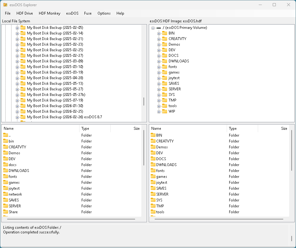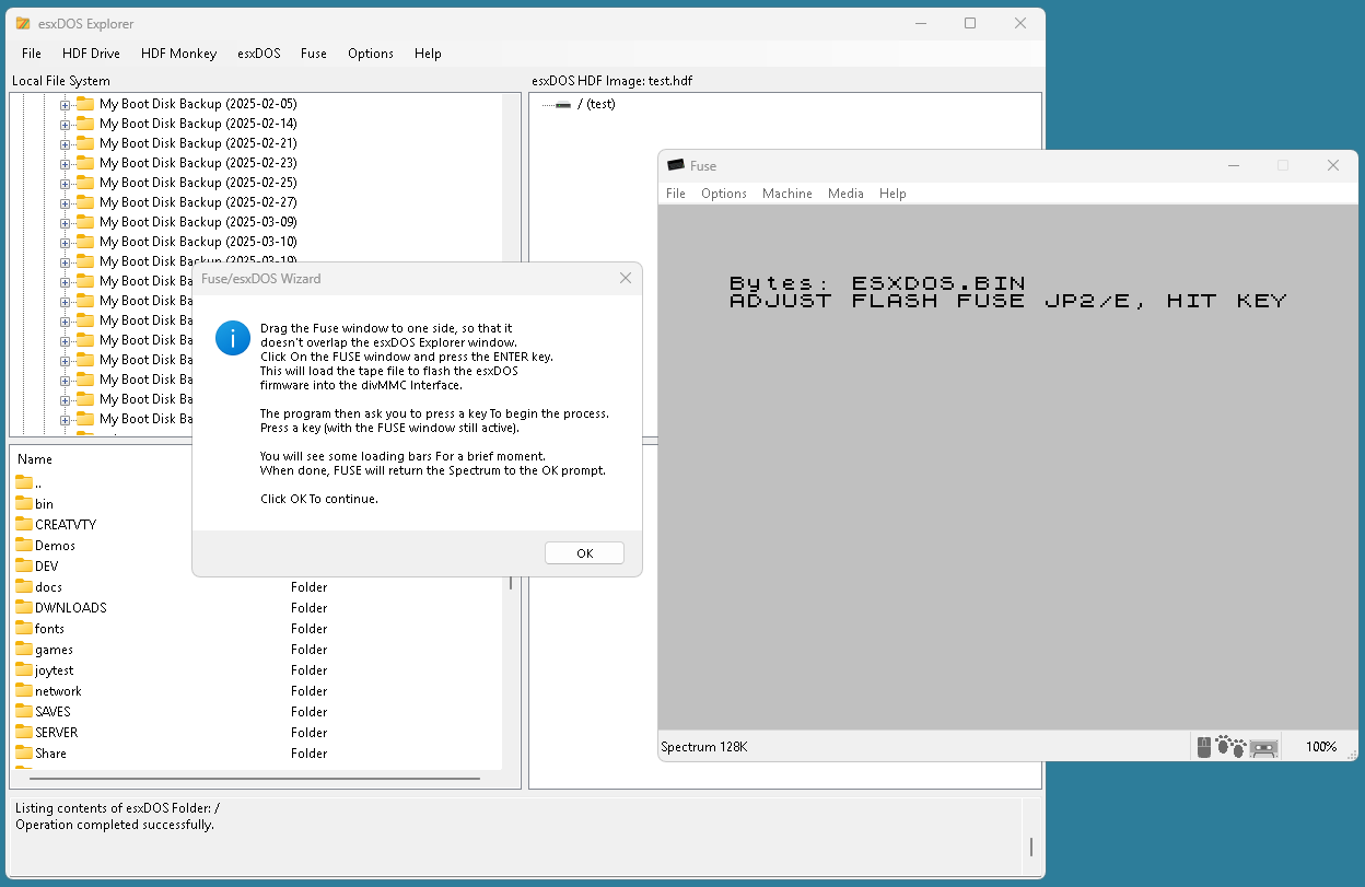The final result is so much more, wit HDFMonkey automations, multiple file and folder drag and drop both ways, formatting HDF files, renaming files and folders locally and with the HDF, and automated download and installation of esxDOS, with checks for the latest version, divMMC ROM flashing wizards for Fuse, and optional automatic installation of a customizable boot menu that has the feel of the Spectrum 128, all within the menus themselves.