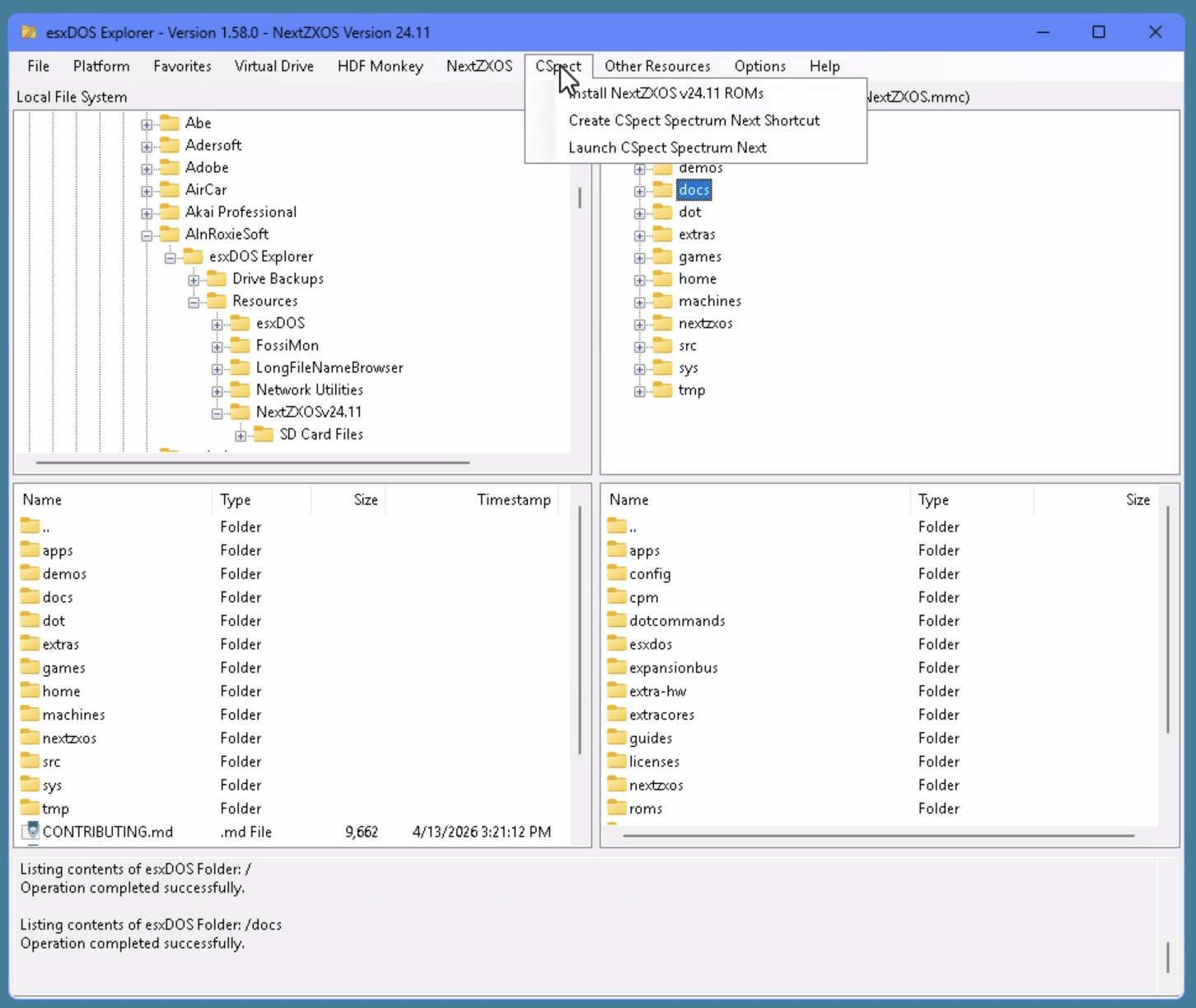 Downloading of the latest build from the Next Team web site is a single menu selection, which will set up a repository within esxDOS Explorer and host the image file contents and ROMs for one-click installation onto your own in-app created virtual media. Another click, and the ROMs are copied to your CSpect installation.